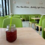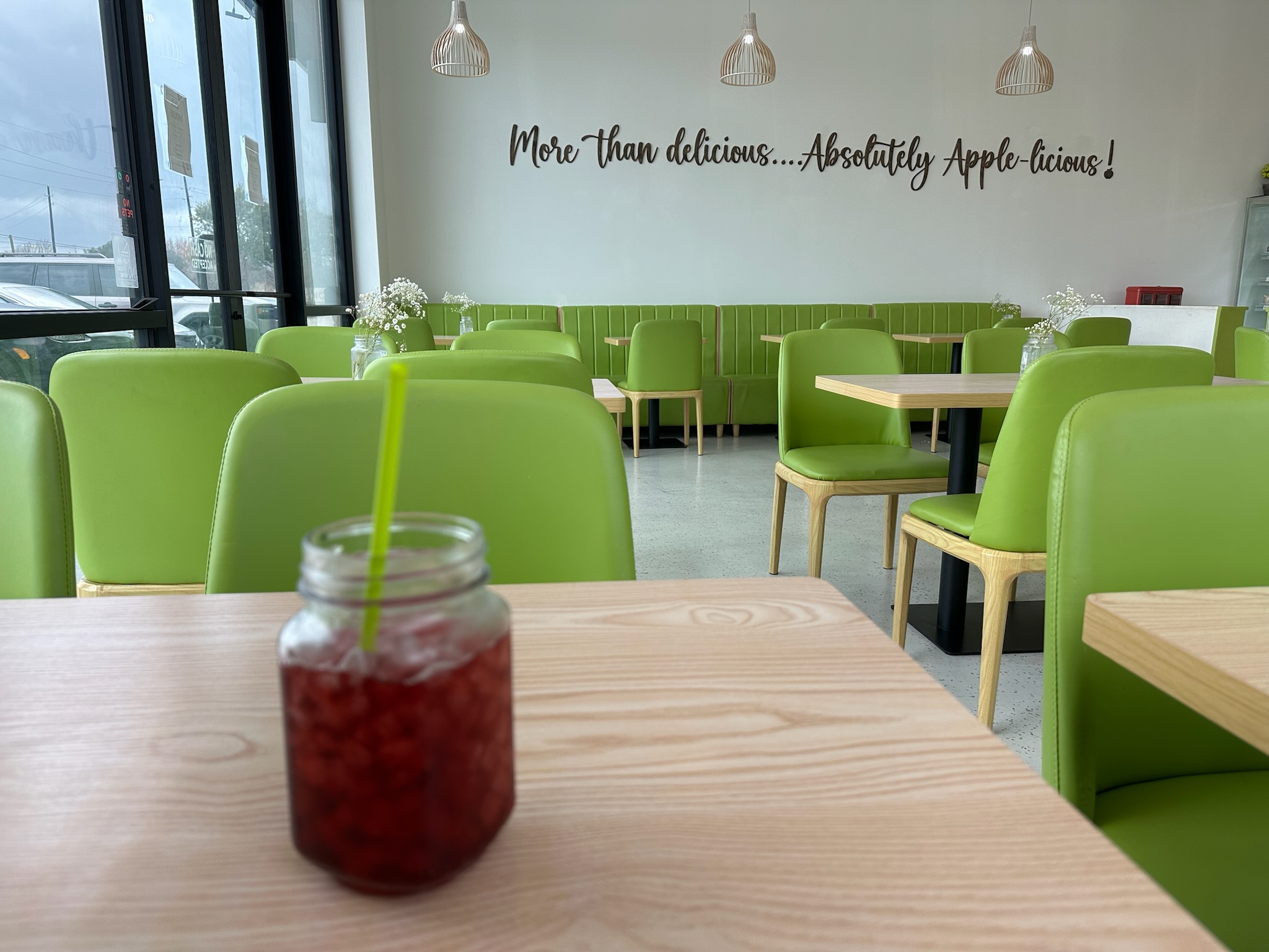 Inside, the space is bright and welcoming, with apple-themed décor, fresh green accents, and light wood tables. The vibe is cozy without being overly styled comfortable enough for a lingering lunch but efficient for a quick bite. There’s indoor seating plus a small patio, which adds flexibility depending on the day.