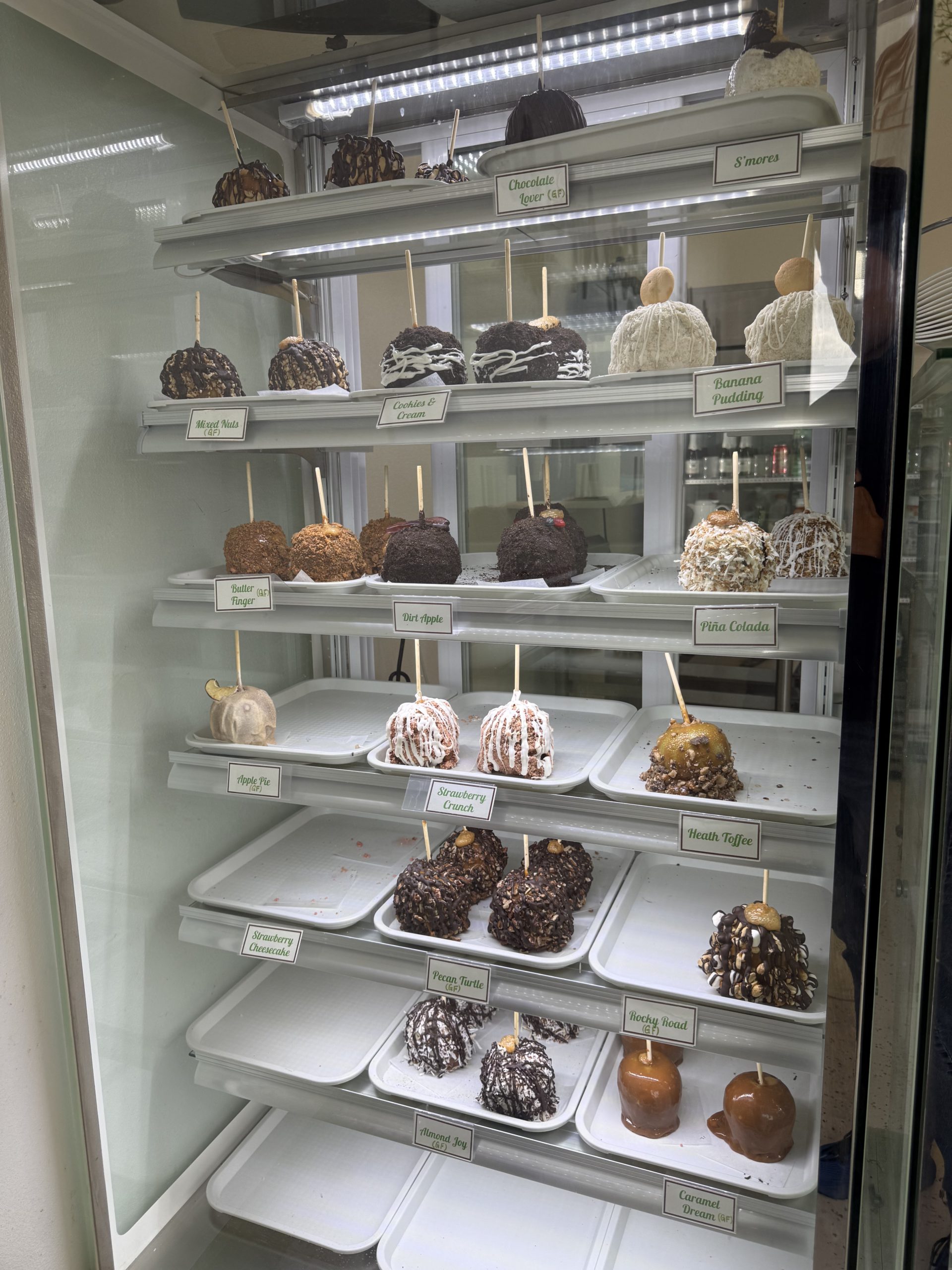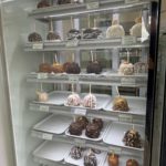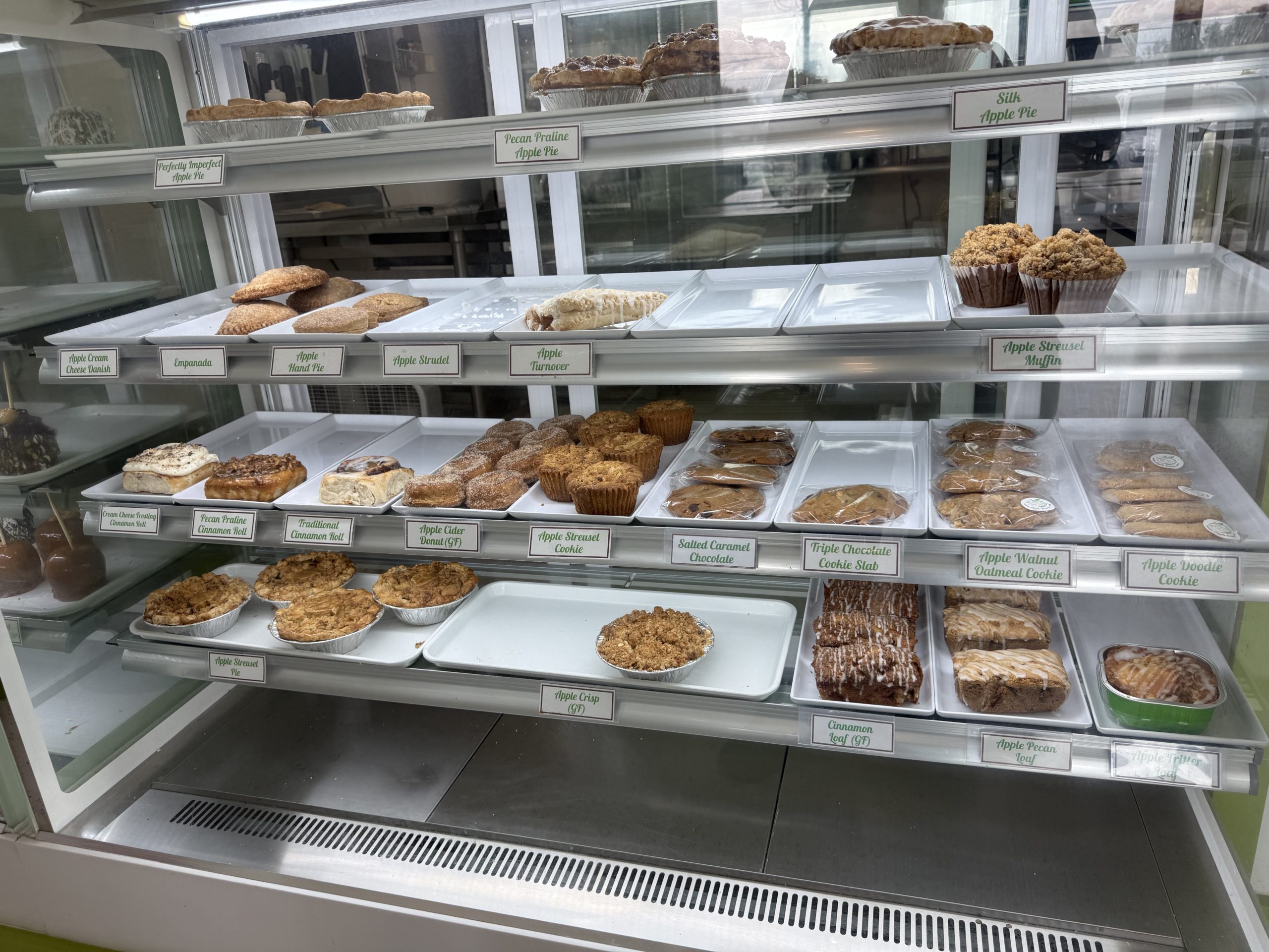 A bakery case filled with muffins, cheesecakes, pies, and gourmet candy apples